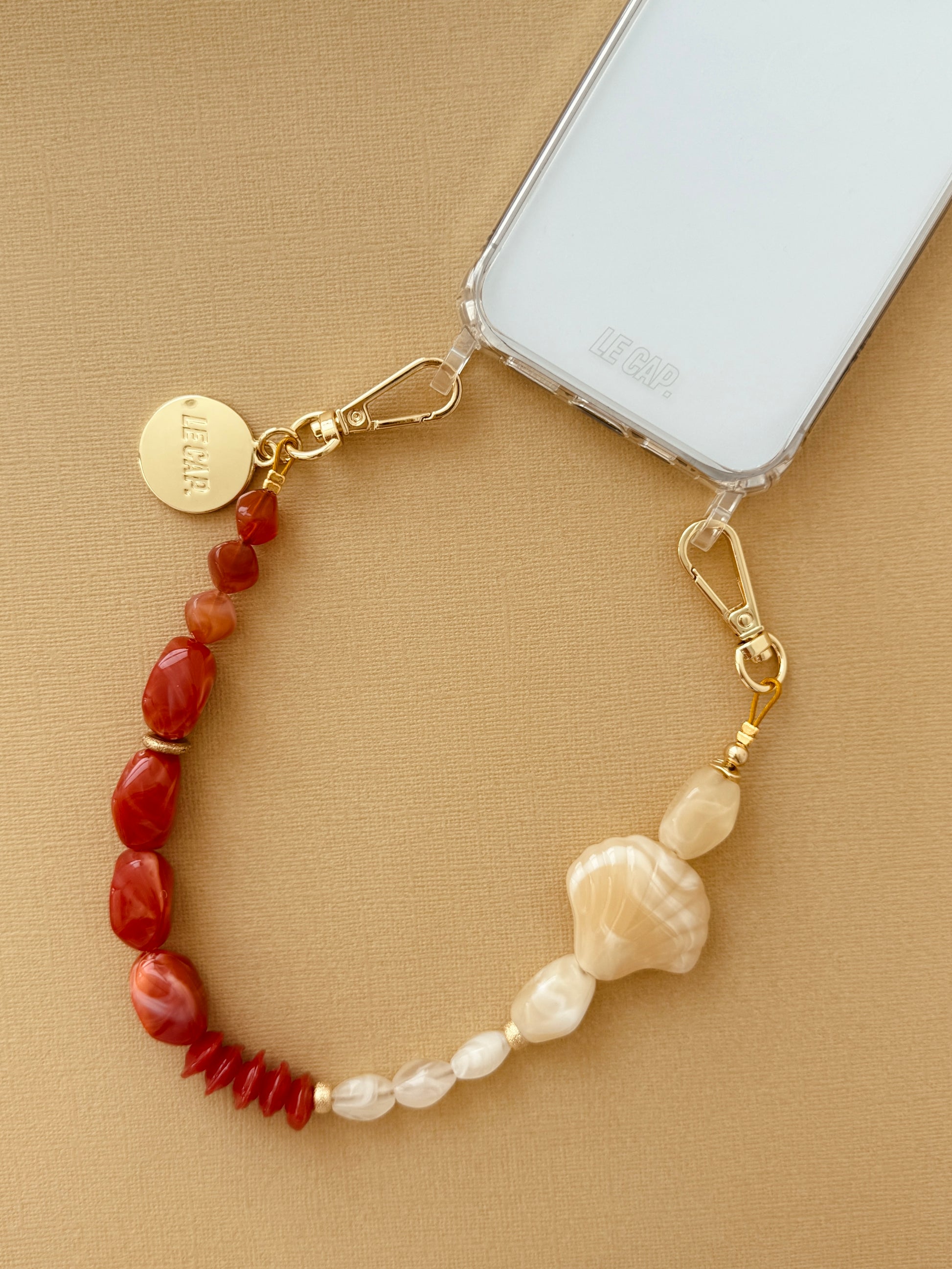 This beaded wrist strap combines shell, glass and acrylic beads. A colour combo born from sunsets over golden beaches.