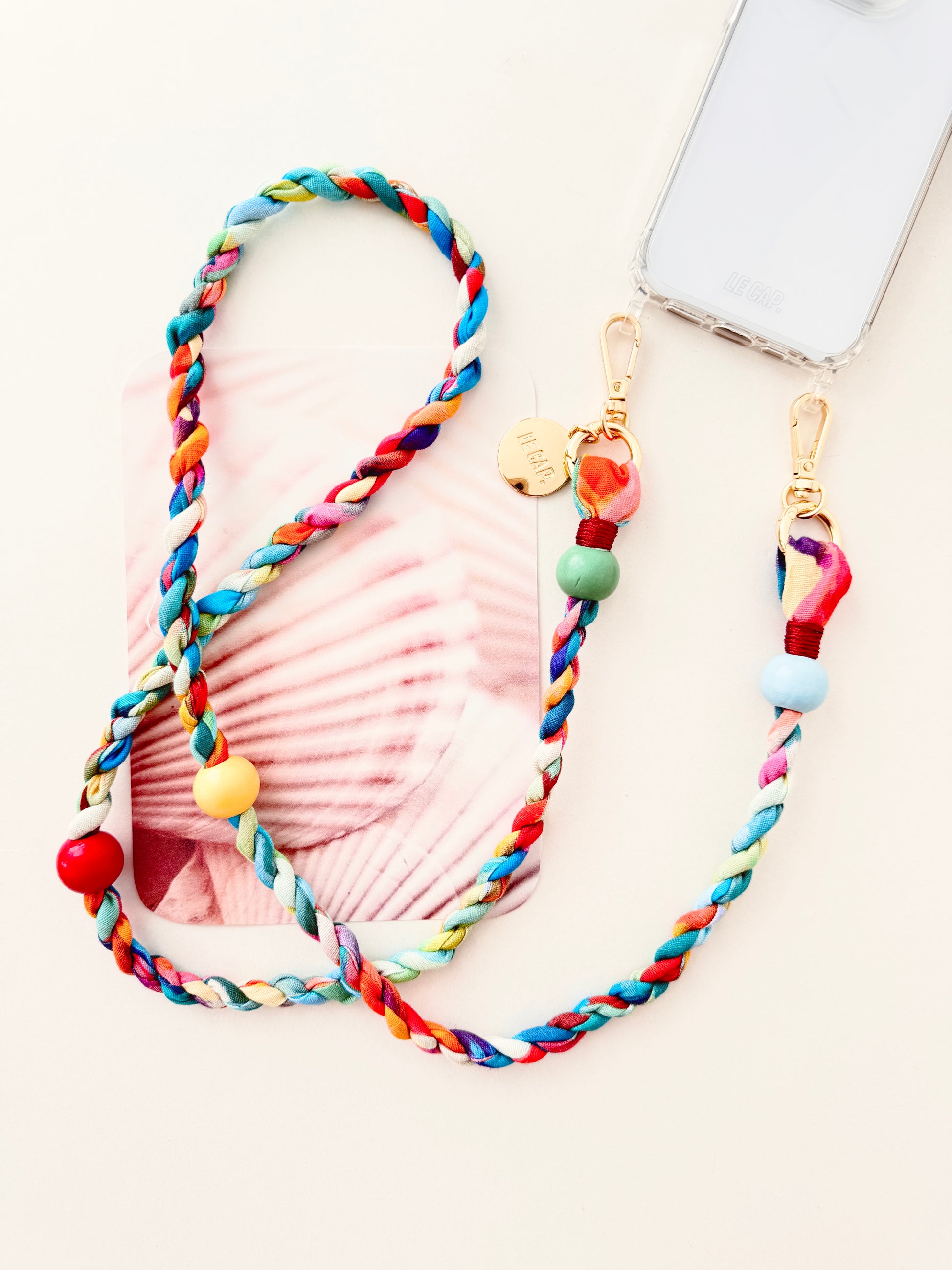 Twisted fabric crossbody strap with colourful wooden beads. Attach straps to your phone, bags or even your water bottle holder!