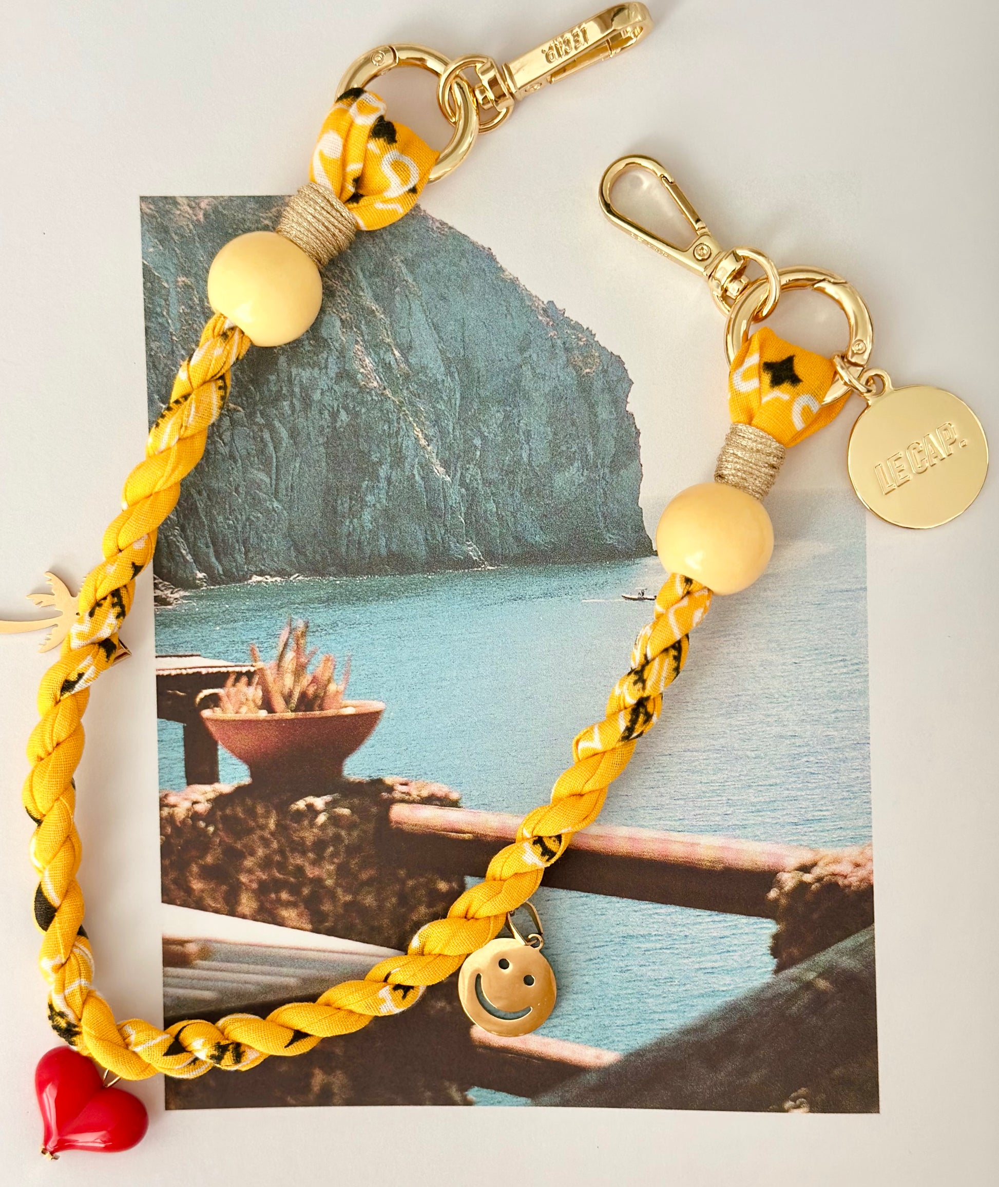 Handcrafted twisted fabric wrist strap with wooden beads and charm detail.