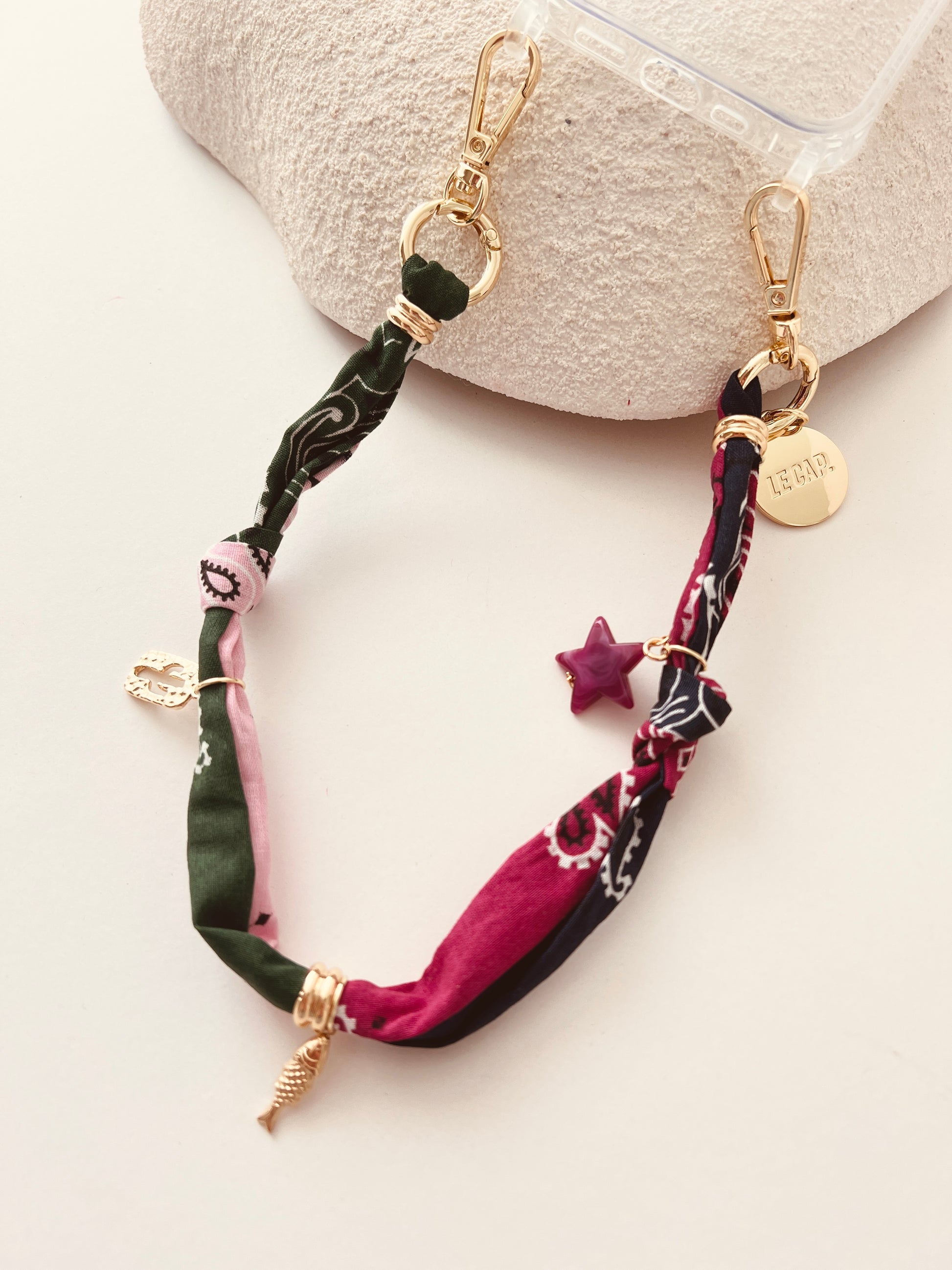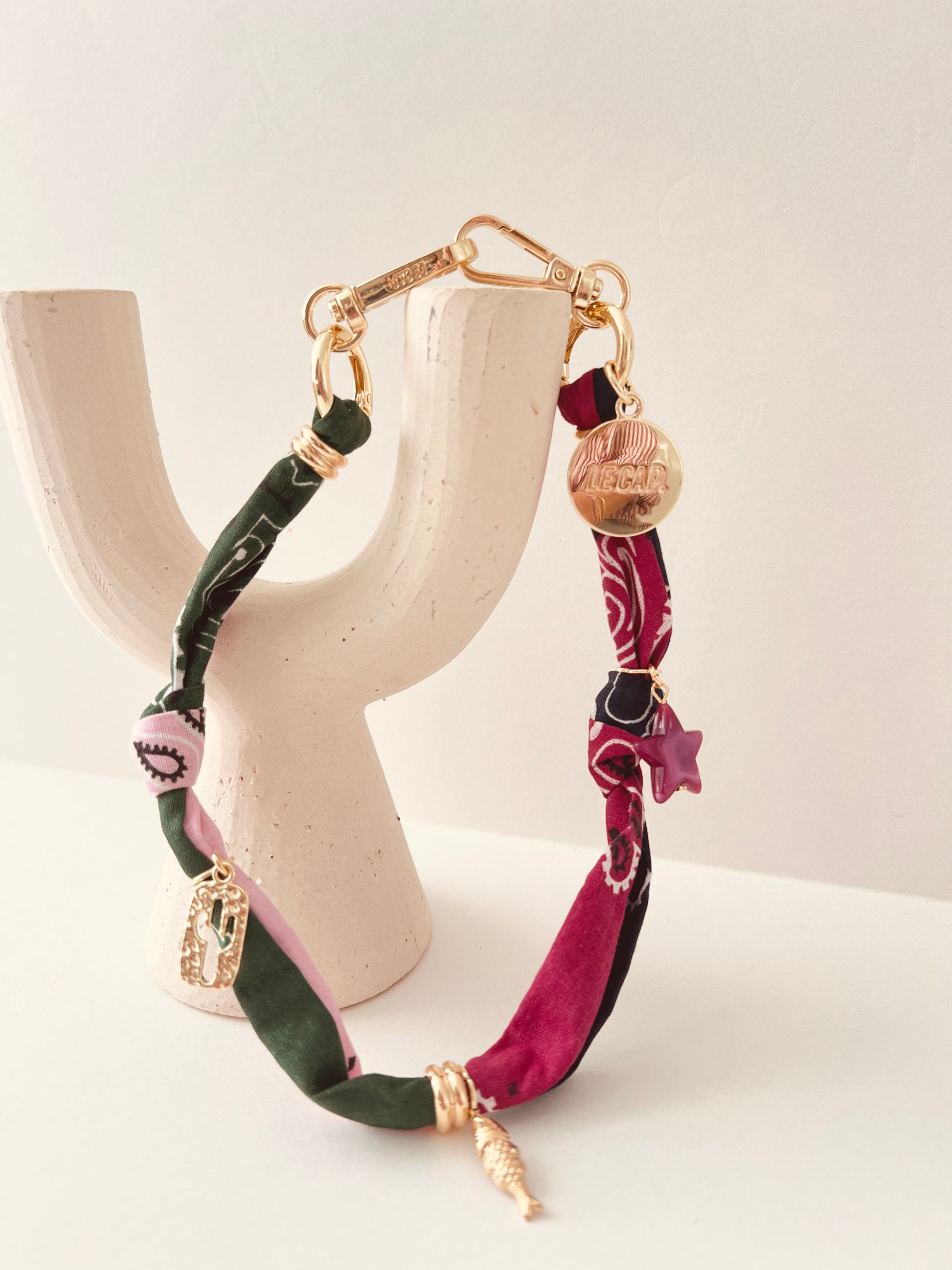 Knotted cotton bandana wrist strap with charm and bead detail.