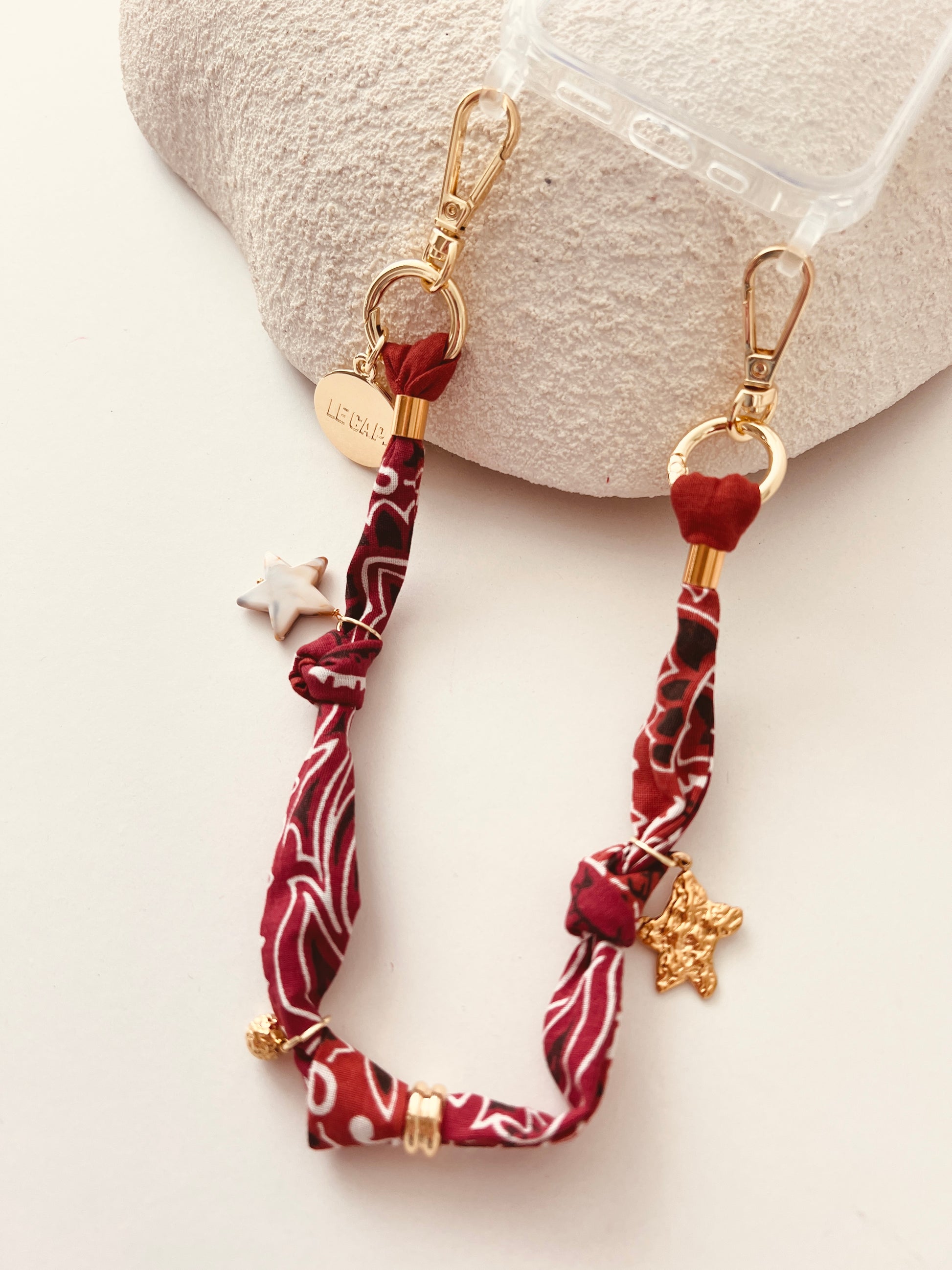 Knotted cotton bandana wrist strap with charm and bead detail.