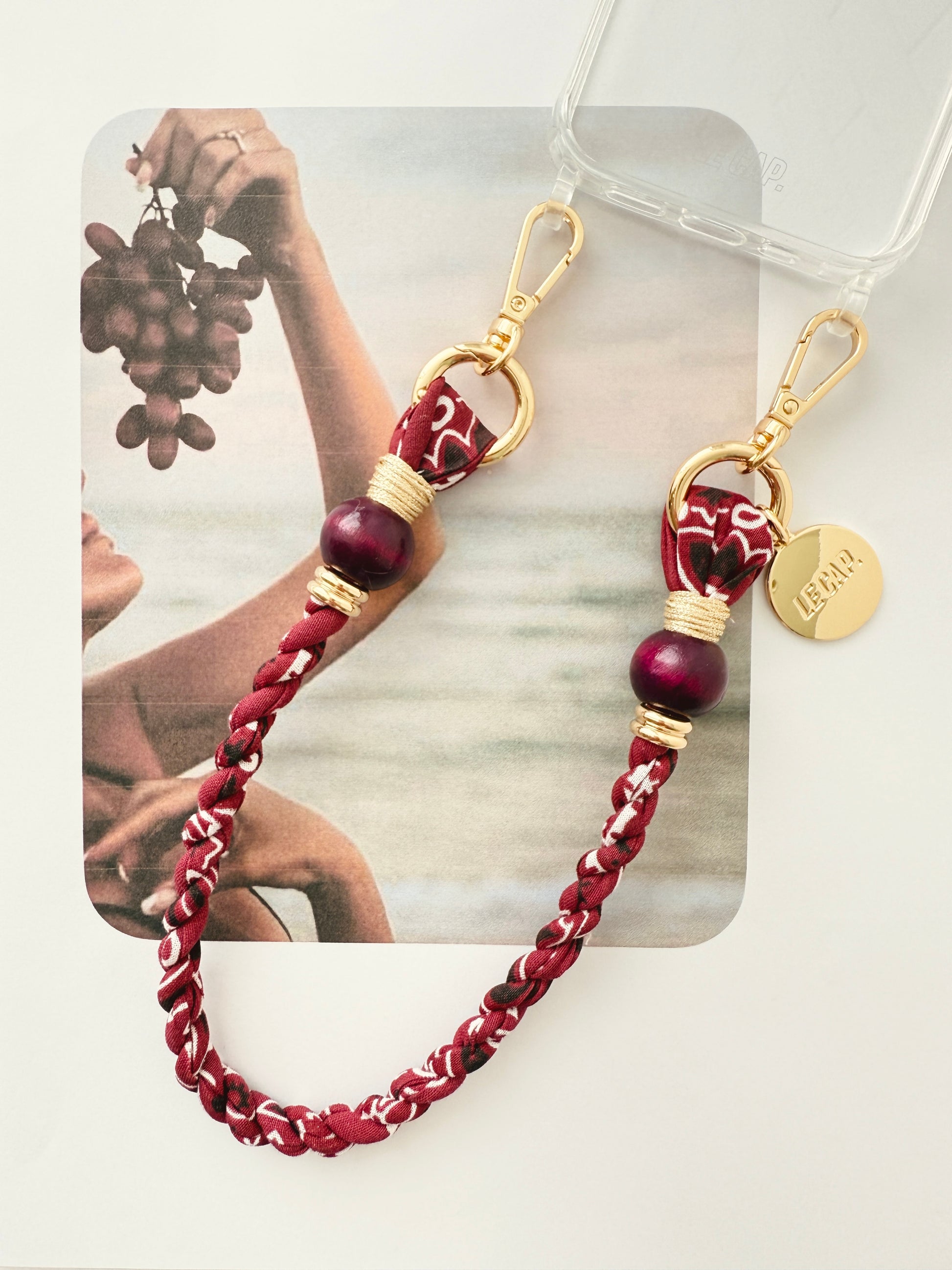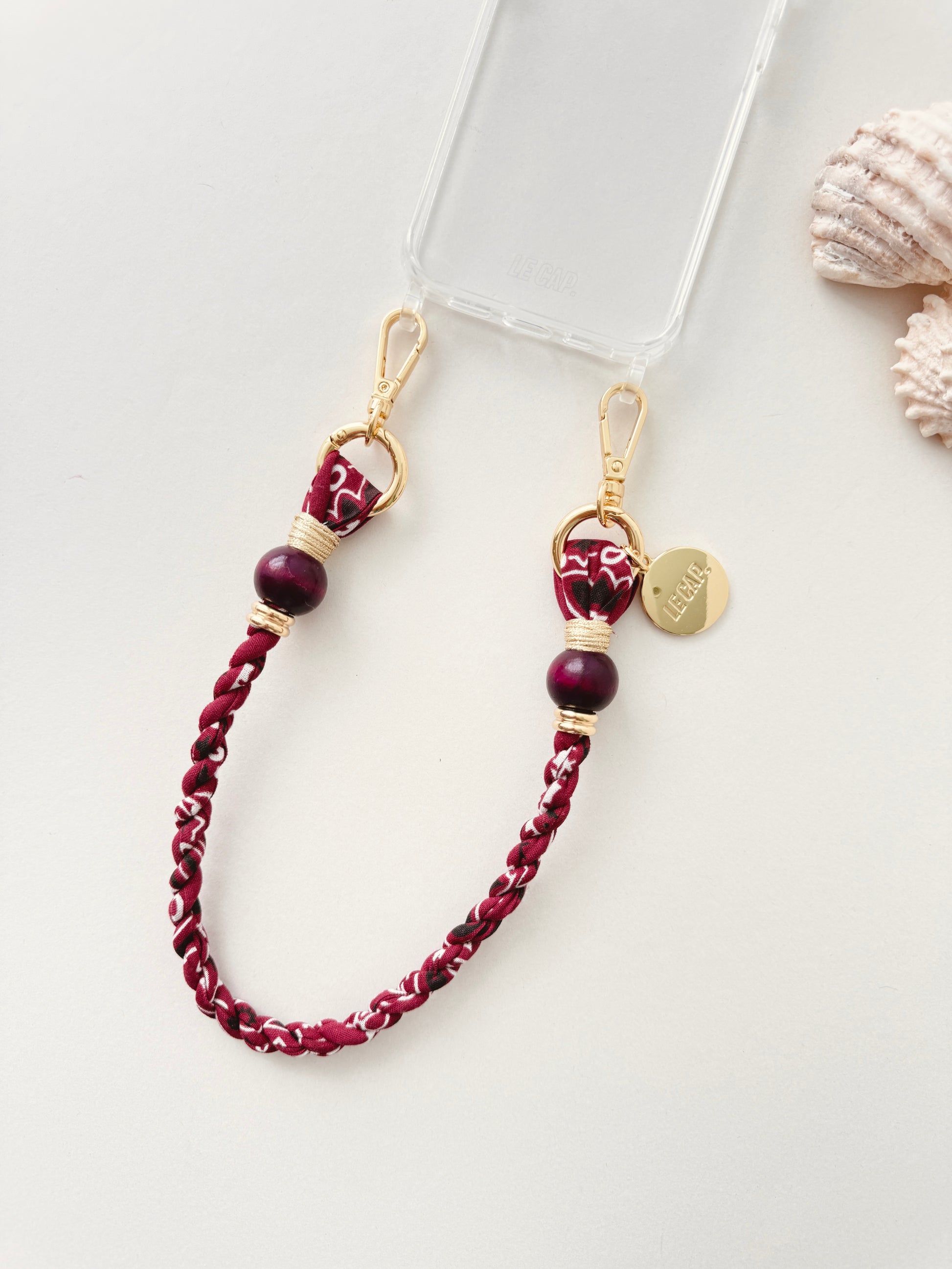 Twisted fabric wrist strap with gold and wooden bead detailing.