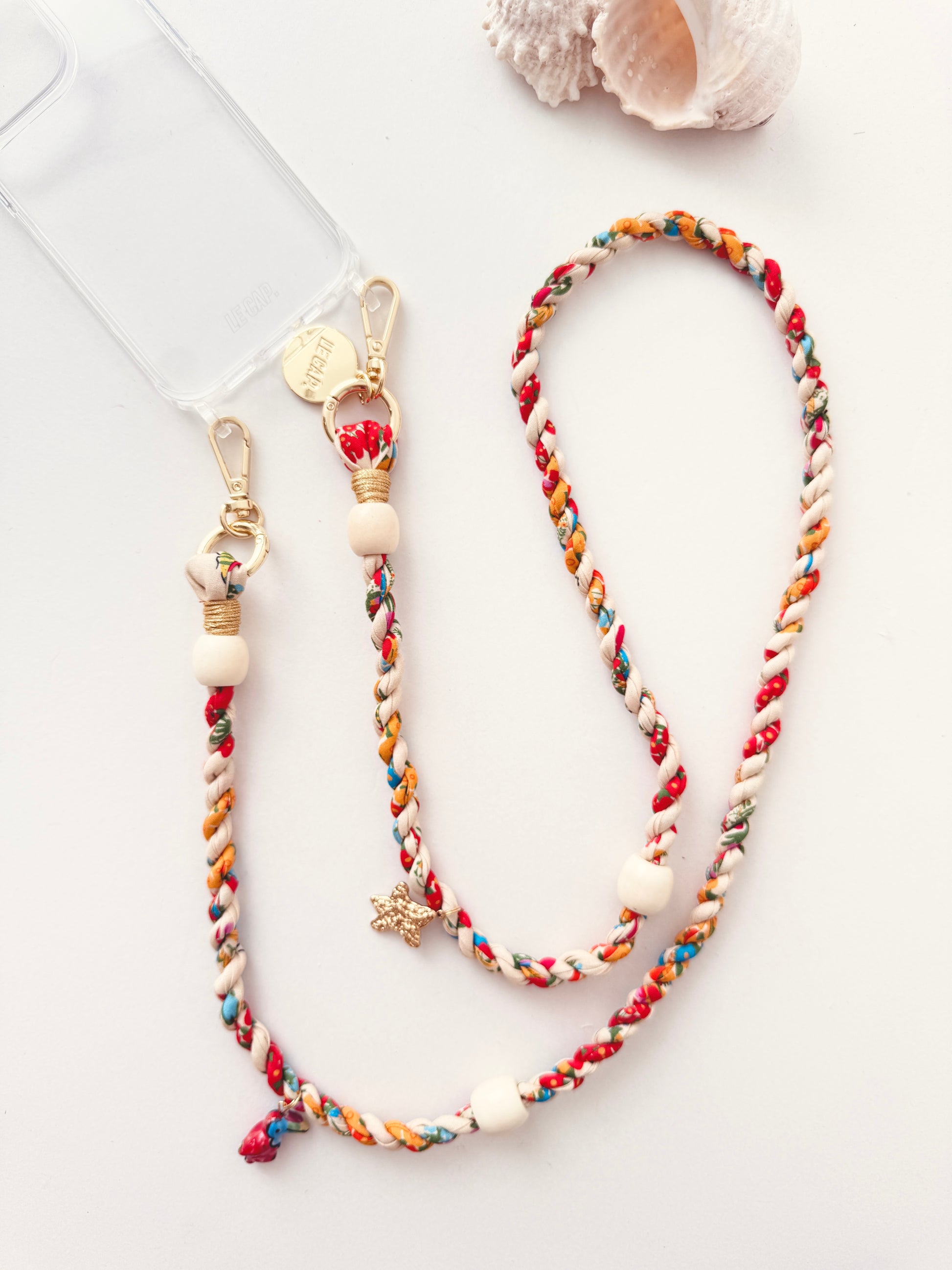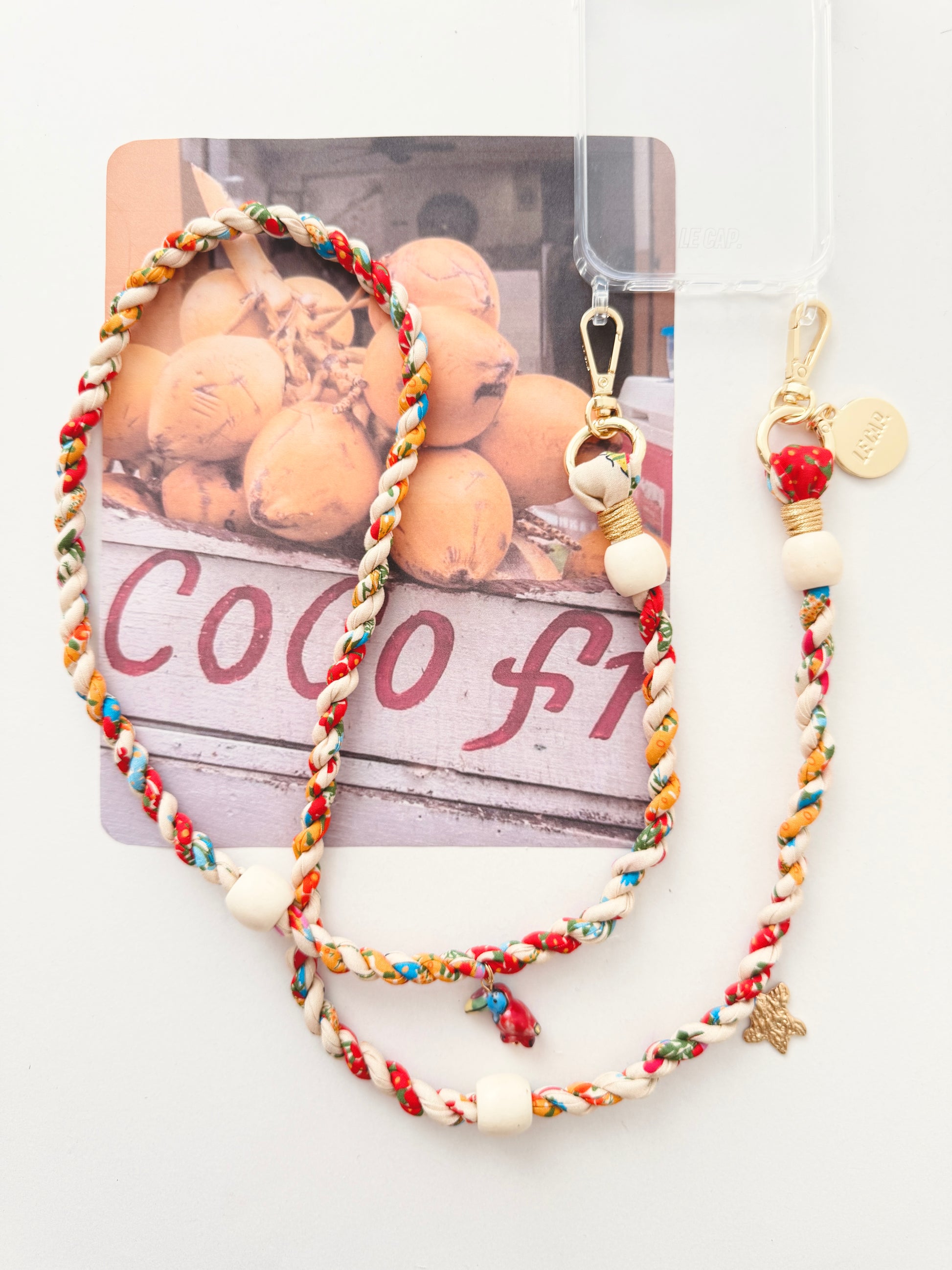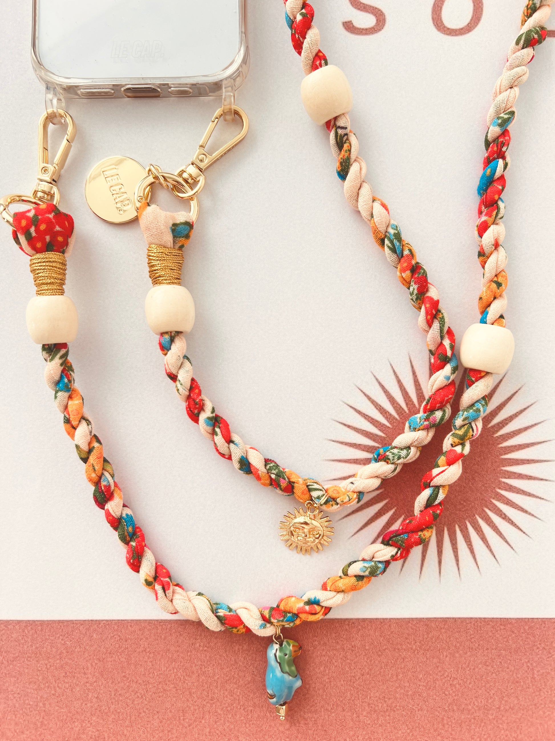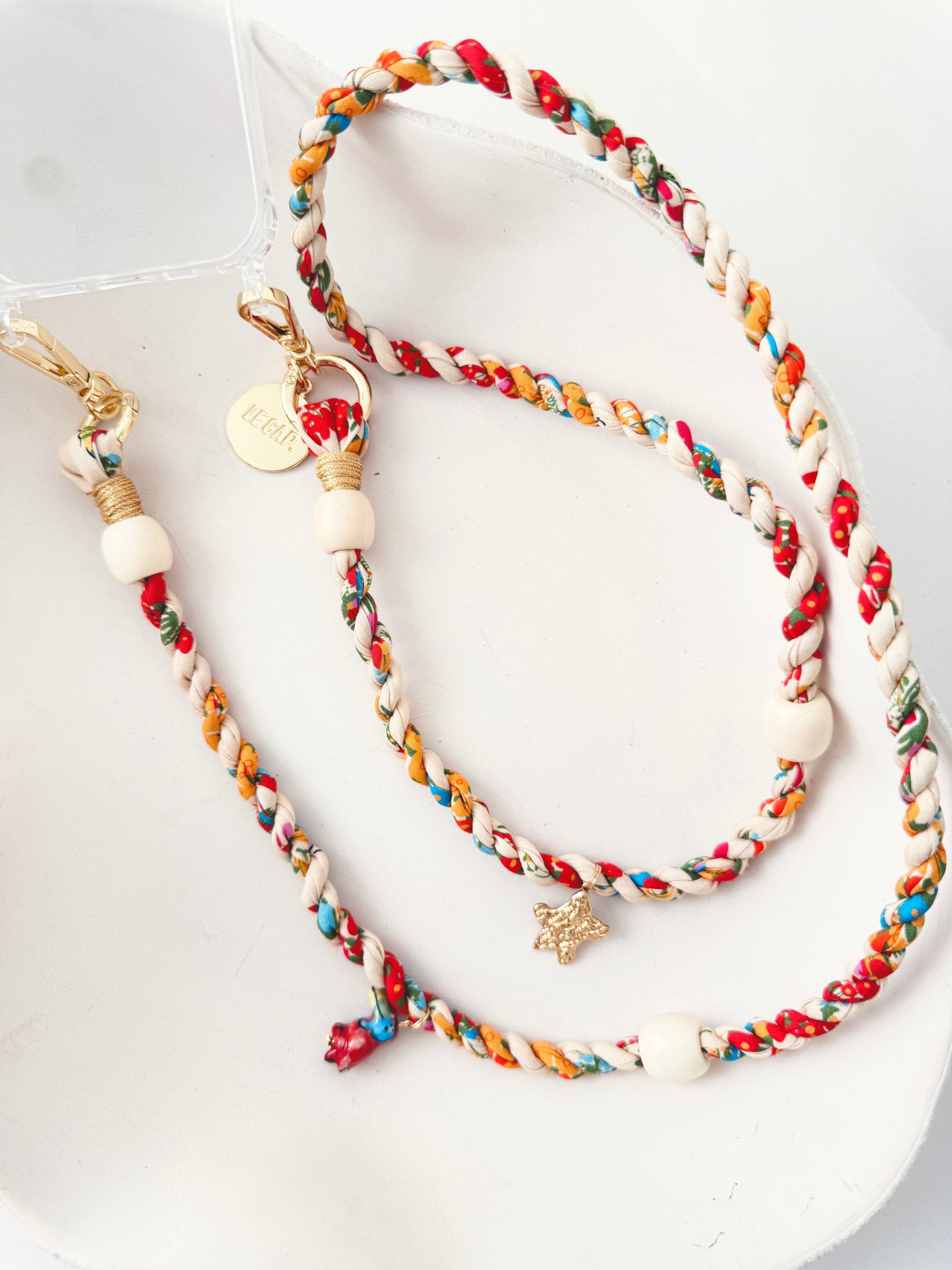This twisted fabric crossbody phone strap features wooden and gold-plated 304 stainless steel beads. Strap charms are detachable. Attach straps to our quilted bags, phone cases or even your water bottle holder!