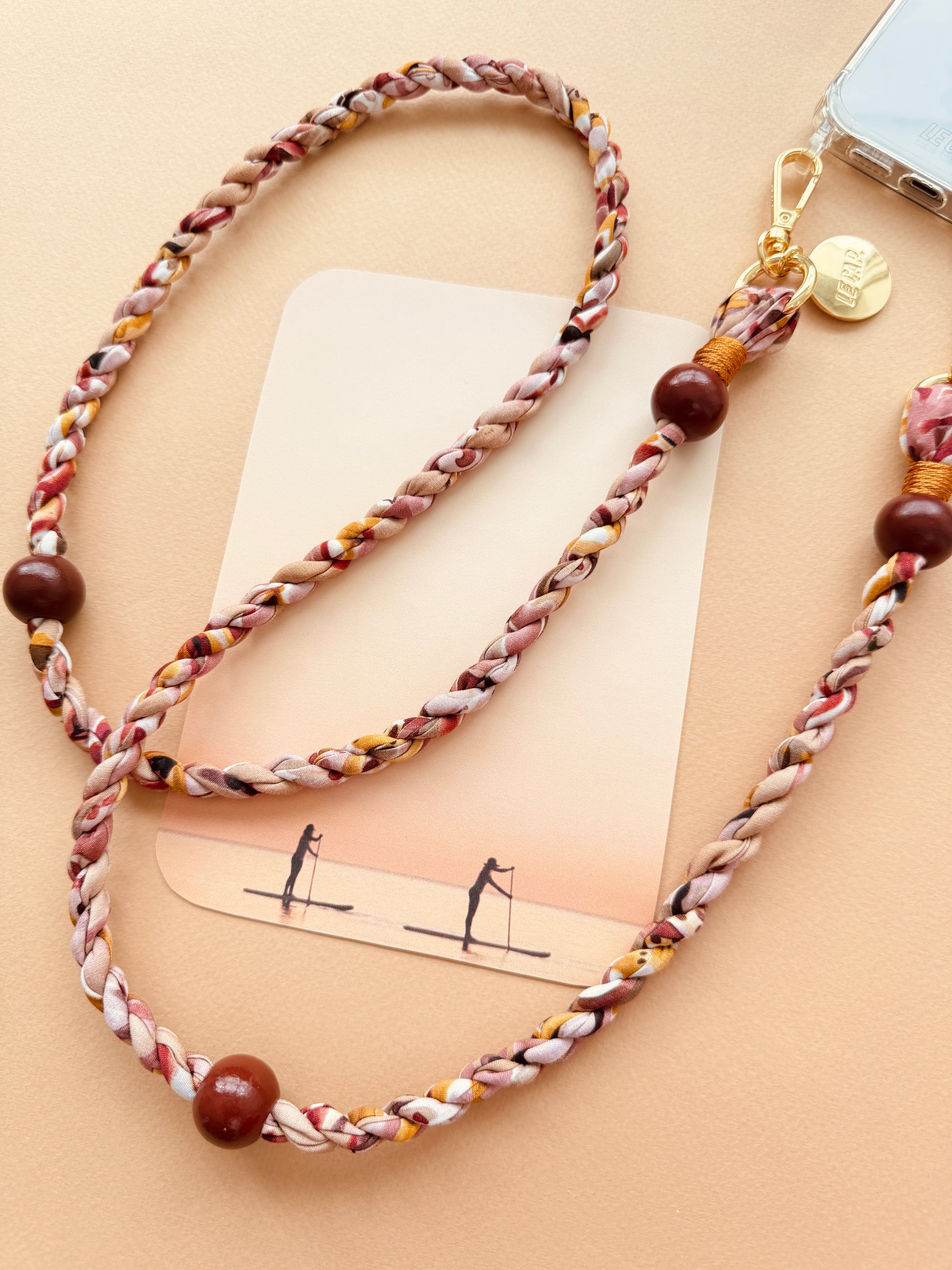 This twisted fabric crossbody strap features nutmeg brown wooden beads and a gold-plated 304 stainless steel tarnish-resistant hardware.