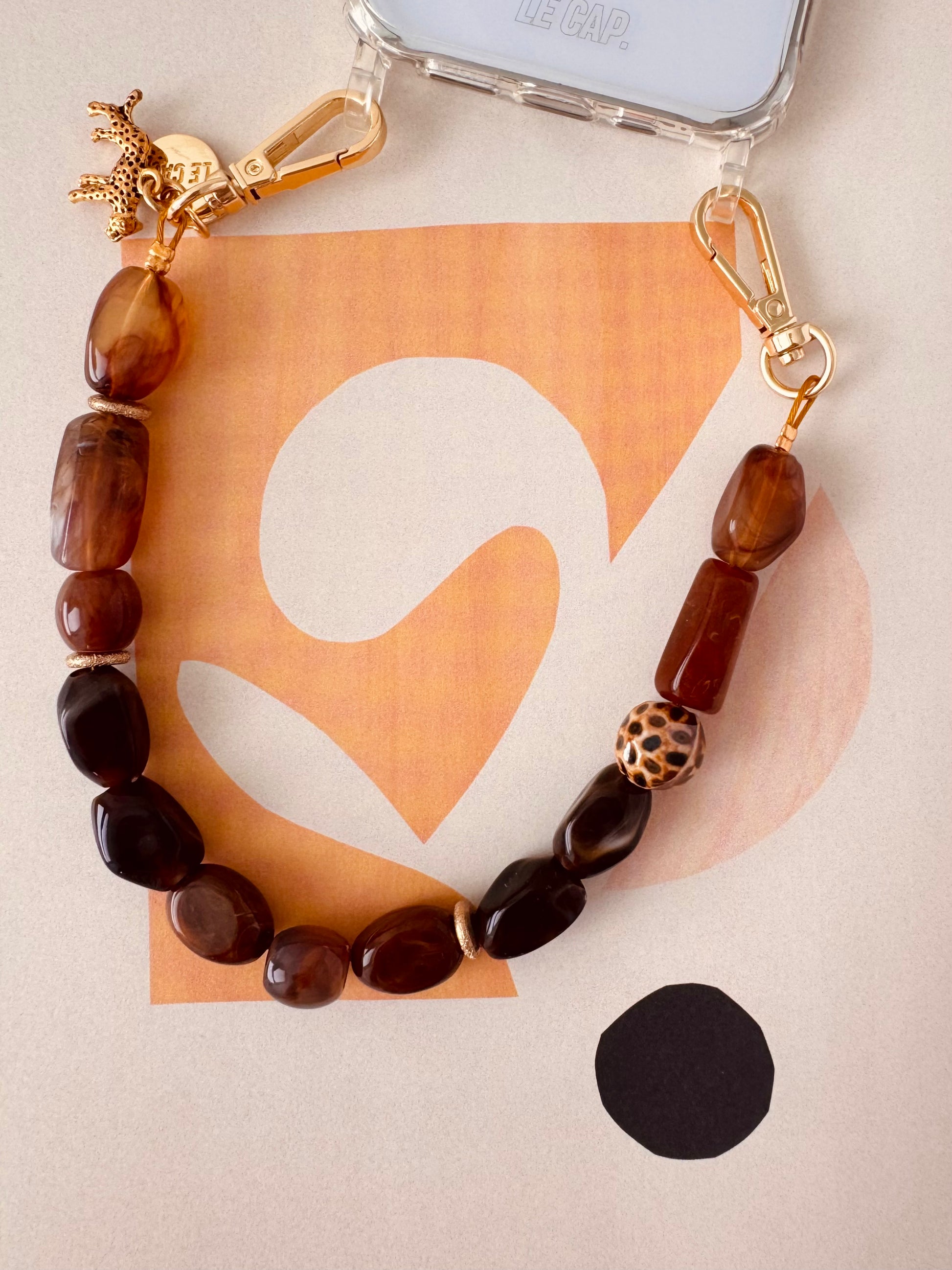 Earthy caramel and espresso marbles finished with gold leopard charm - bold and unapologetically chic.