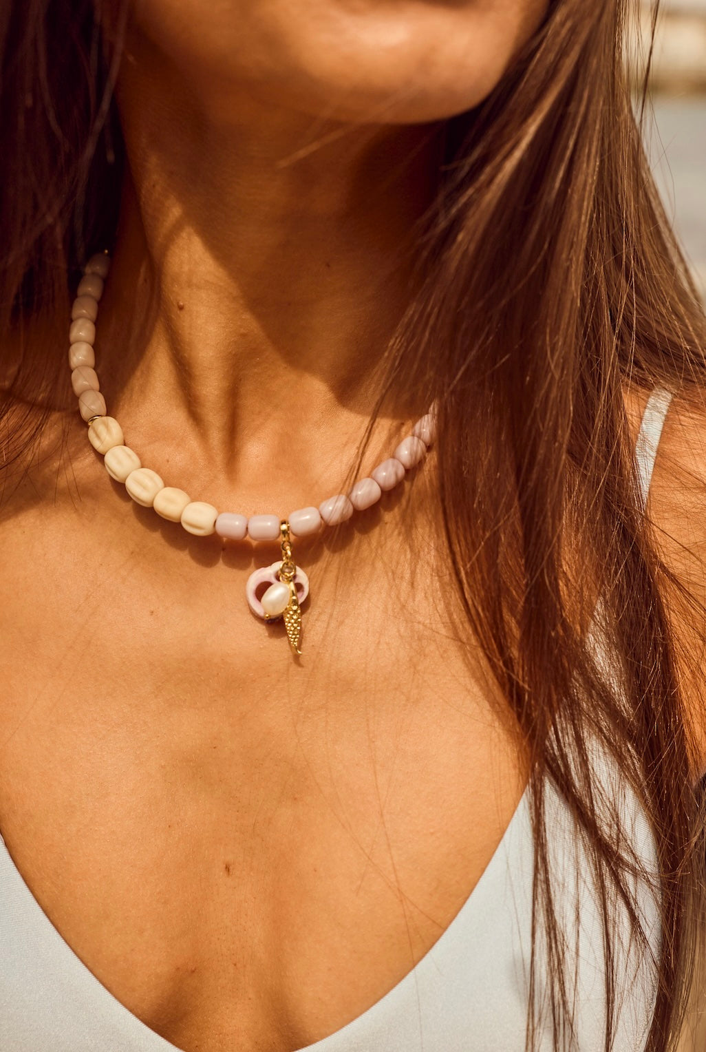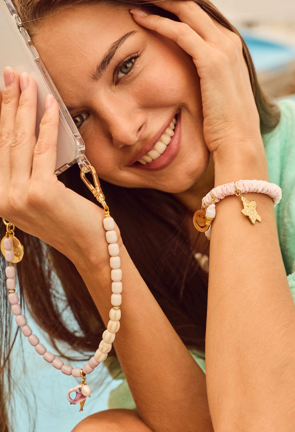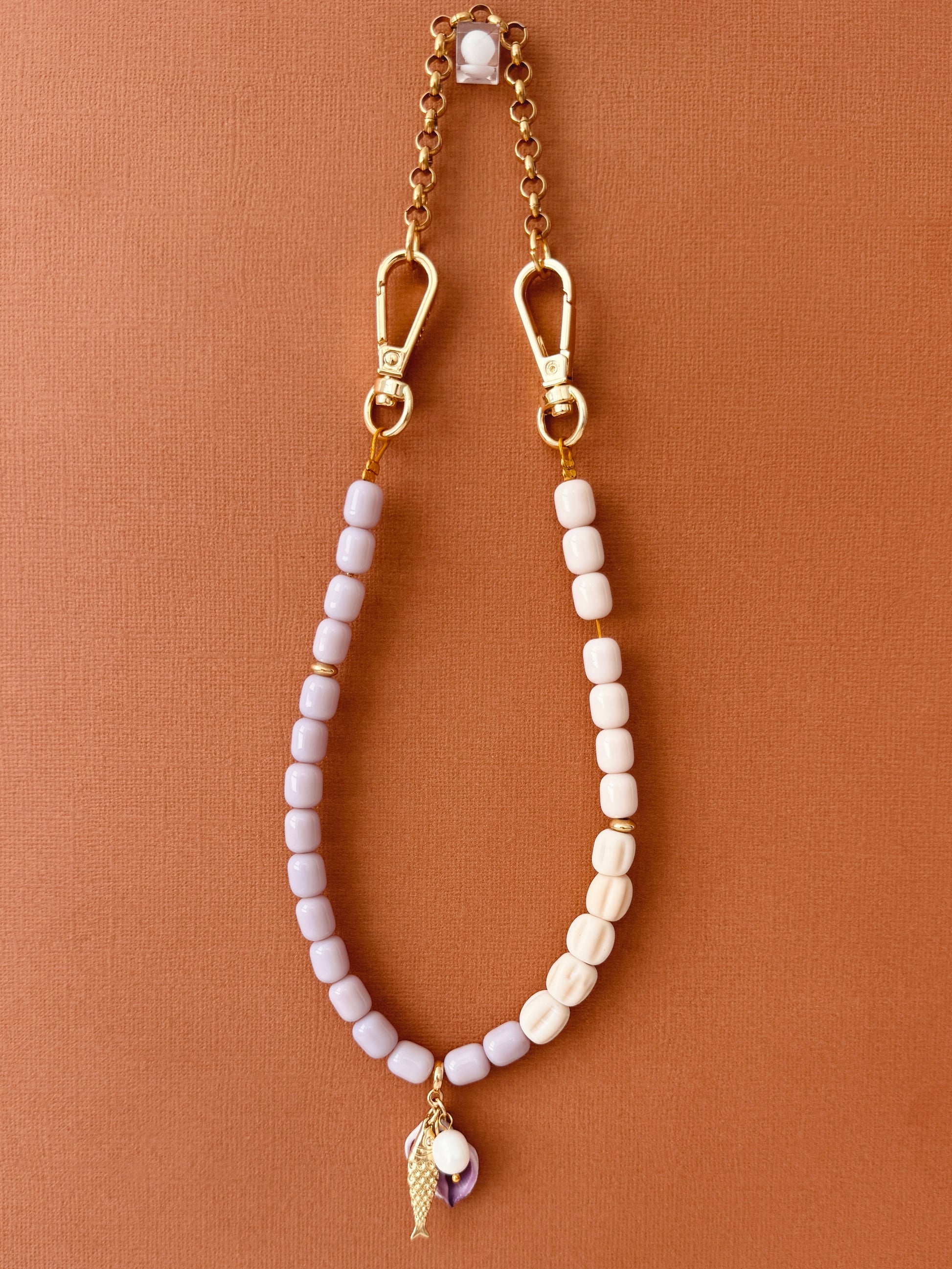 This beaded wrist strap combines glass and metal beads. Inspired by hues of lavender coral the wrist strap features a pendant cluster including a pearl, fish and purple periwinkle.