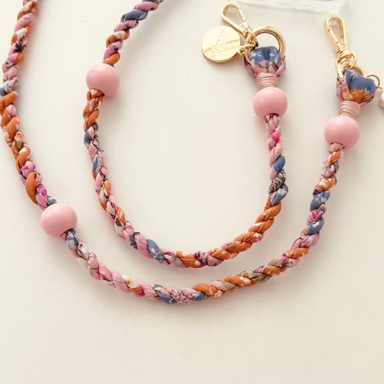 This twisted fabric crossbody phone strap features wooden beads. Strap charms are detachable. Attach straps to our quilted bags, phone cases or even your water bottle holder!