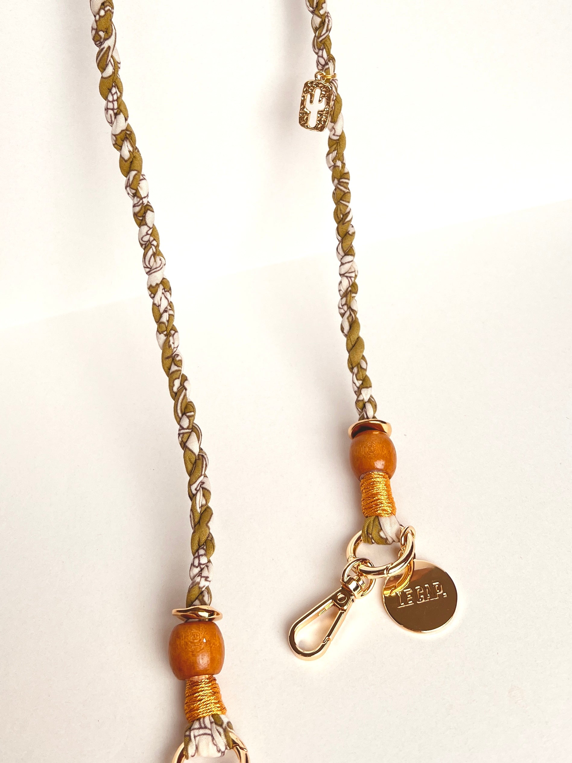This twisted fabric crossbody phone strap features wooden, gold-plated 304 stainless steel beads and charm. Strap charms are detachable. Attach straps to our phone cases, quilted bags or even your water bottle holder!