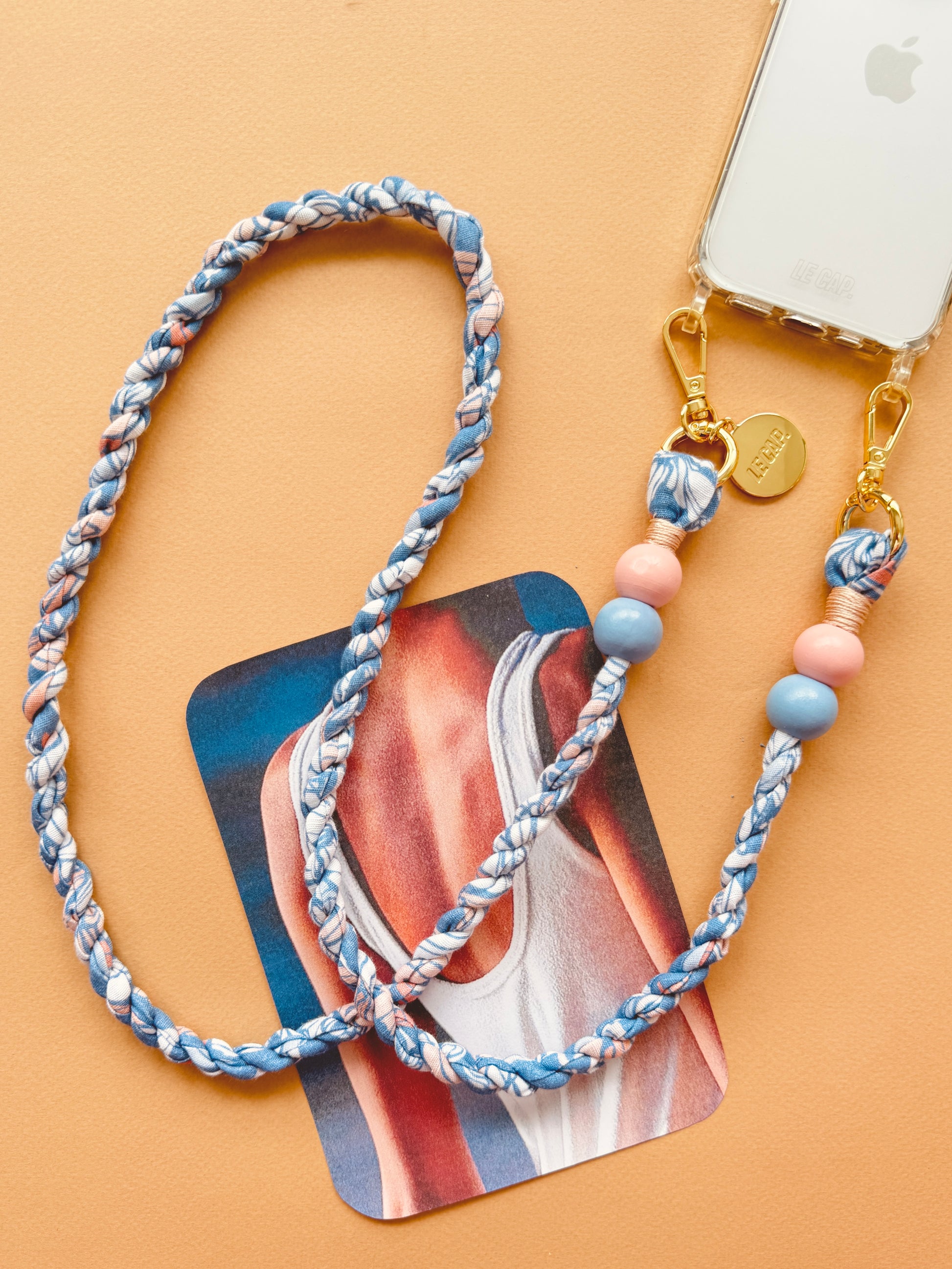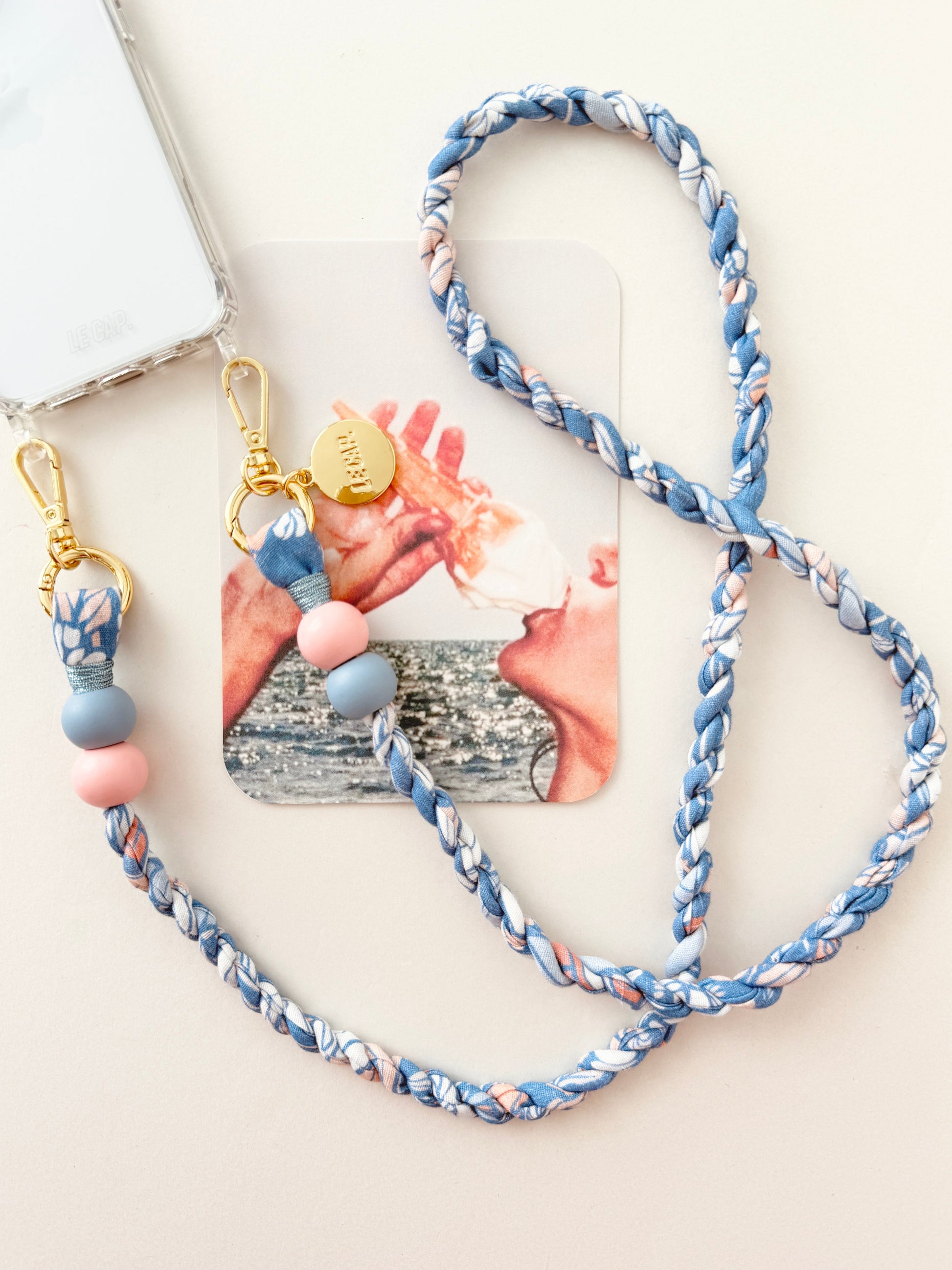 This twisted fabric crossbody phone strap features wooden and gold-plated 304 stainless steel beads. Strap charms are detachable. Attach straps to our quilted bags, phone cases or even your water bottle holder!