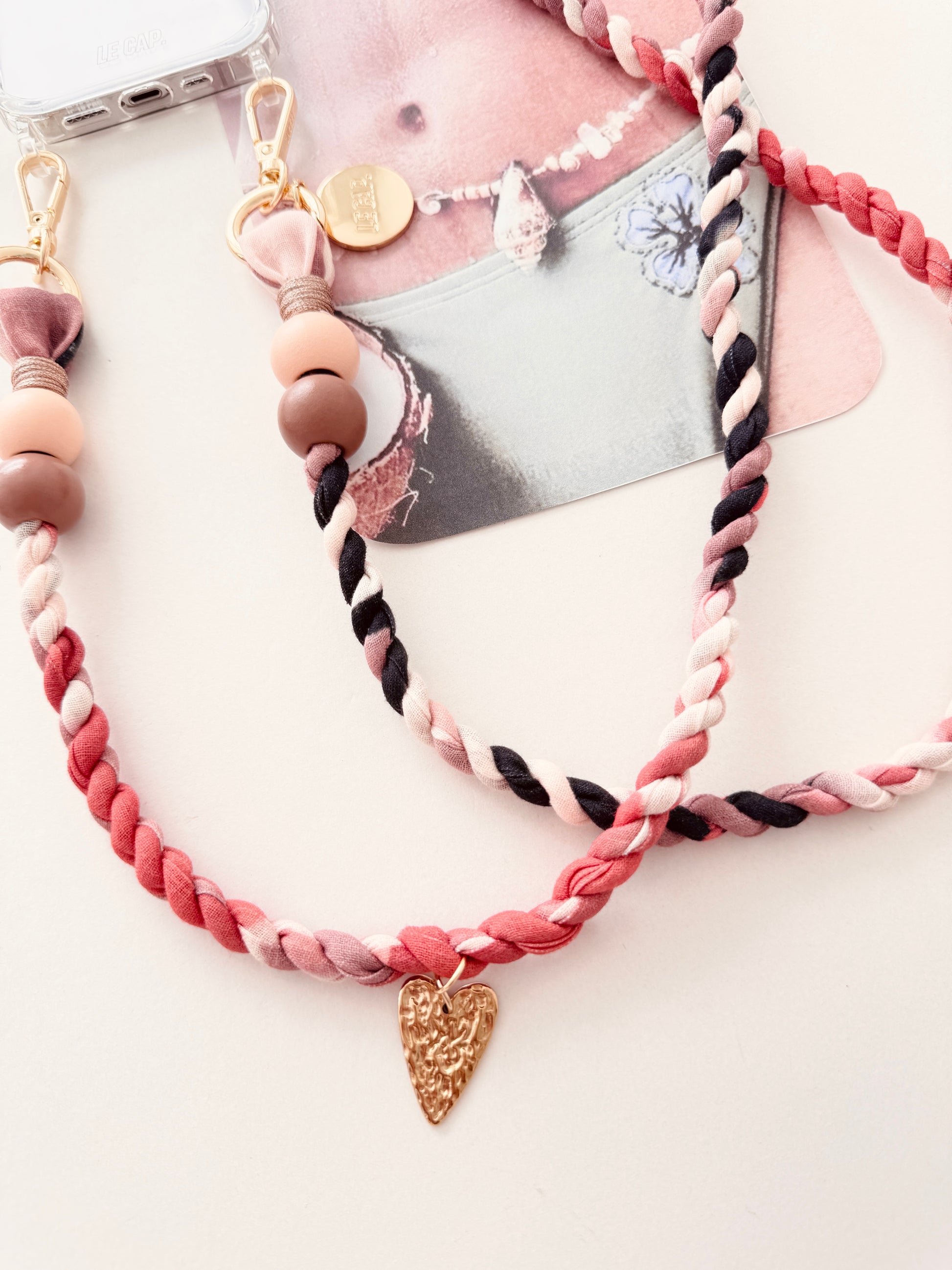 With its earthy tones and gold heart charm detail, this twisted fabric crossbody phone strap will go with everything in your wardrobe.