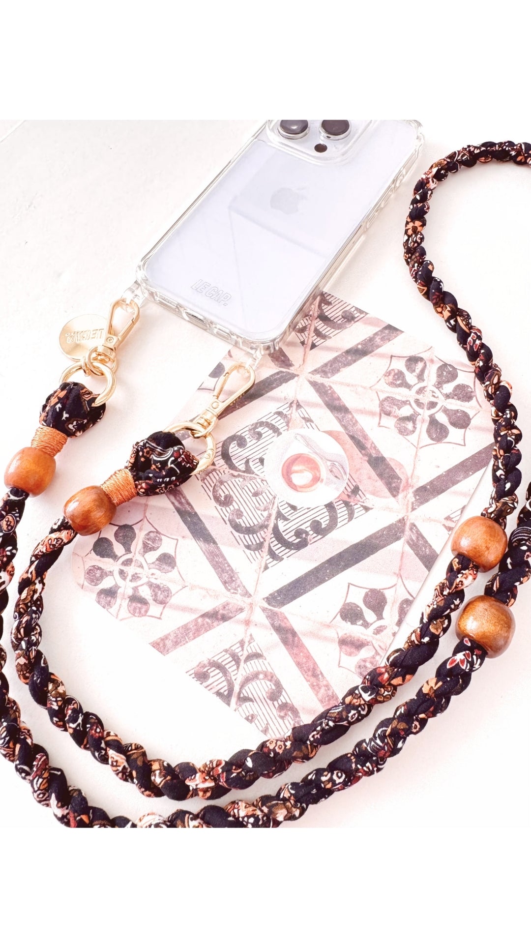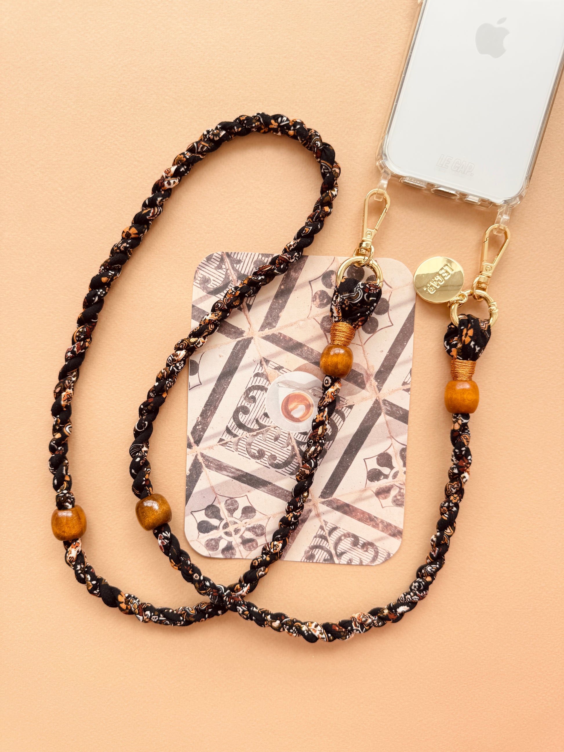 This twisted fabric crossbody strap features tan wooden beads and a gold-plated 304 stainless steel tarnish-resistant hardware.