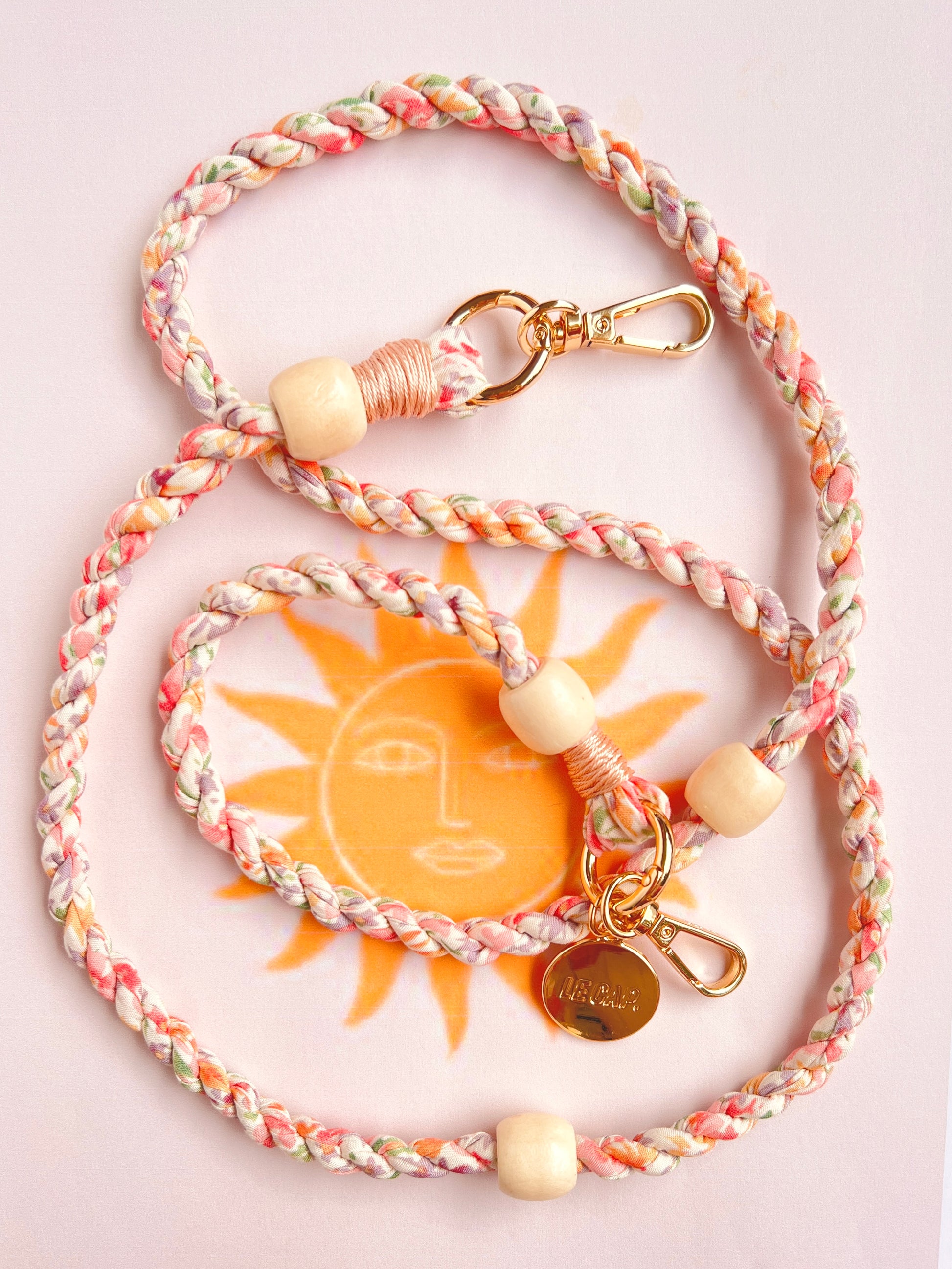 This twisted fabric crossbody phone strap features wooden beads. Strap charms are detachable. Attach straps to our quilted bags, phone cases or even your water bottle holder!