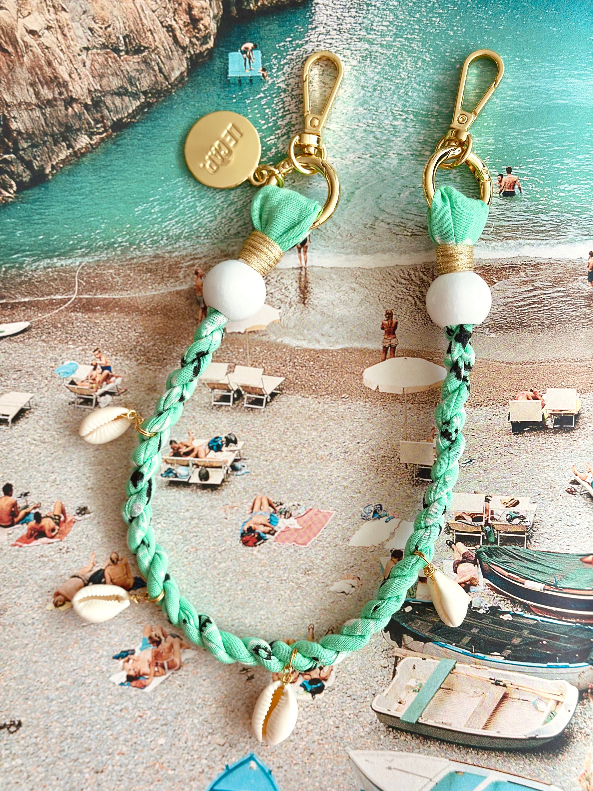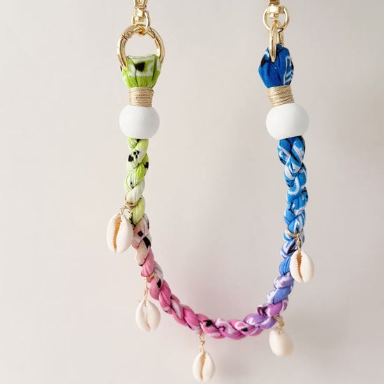 Handcrafted twisted fabric wrist strap with wooden beads and shell charm detail.