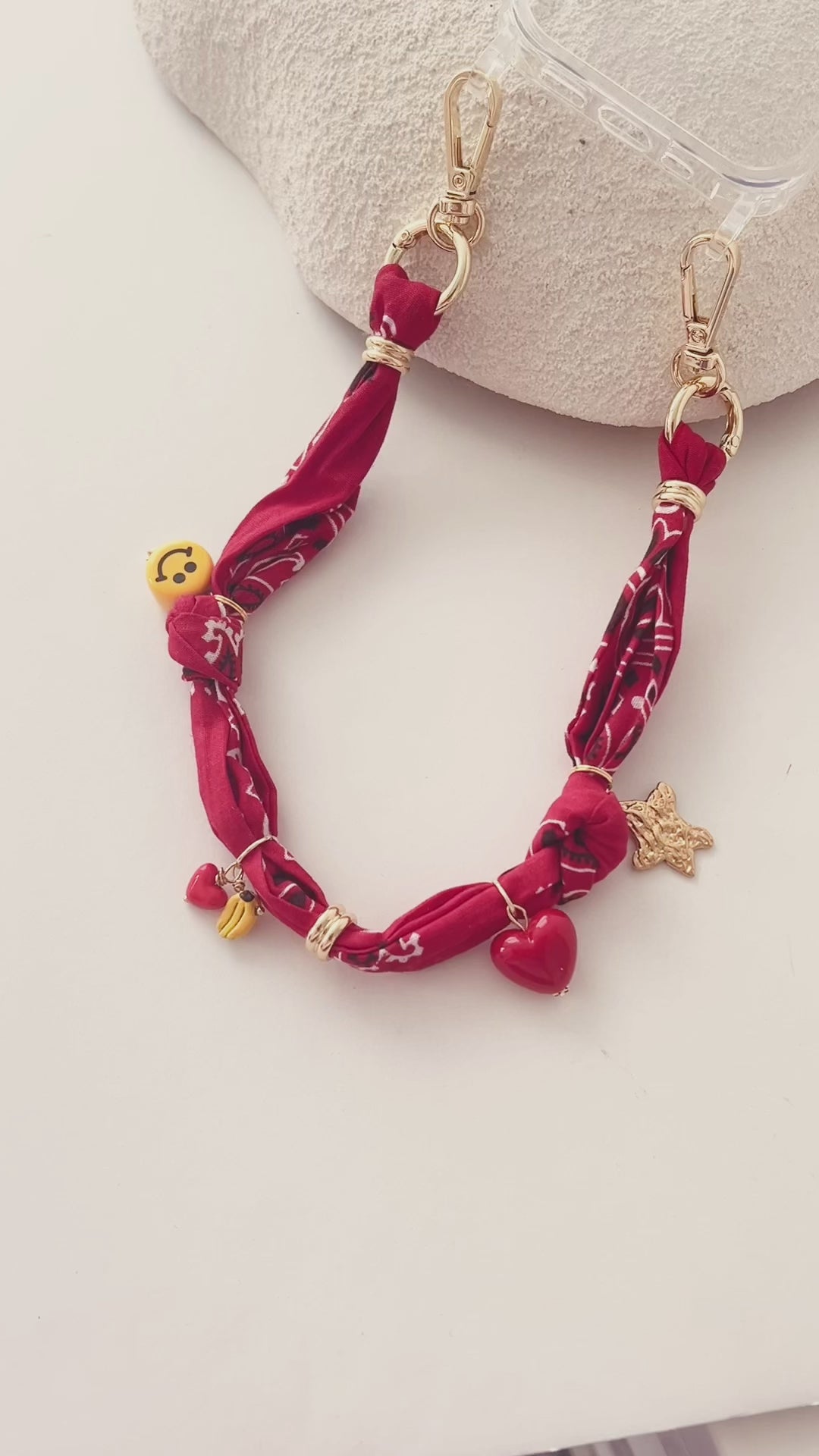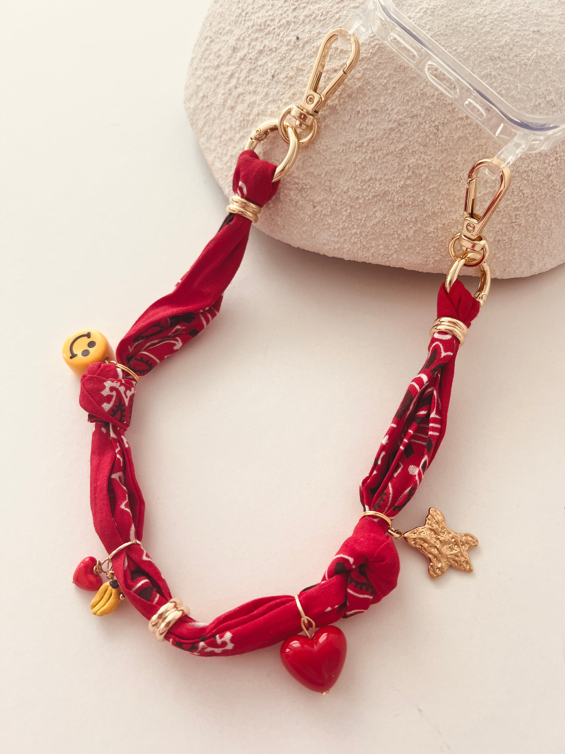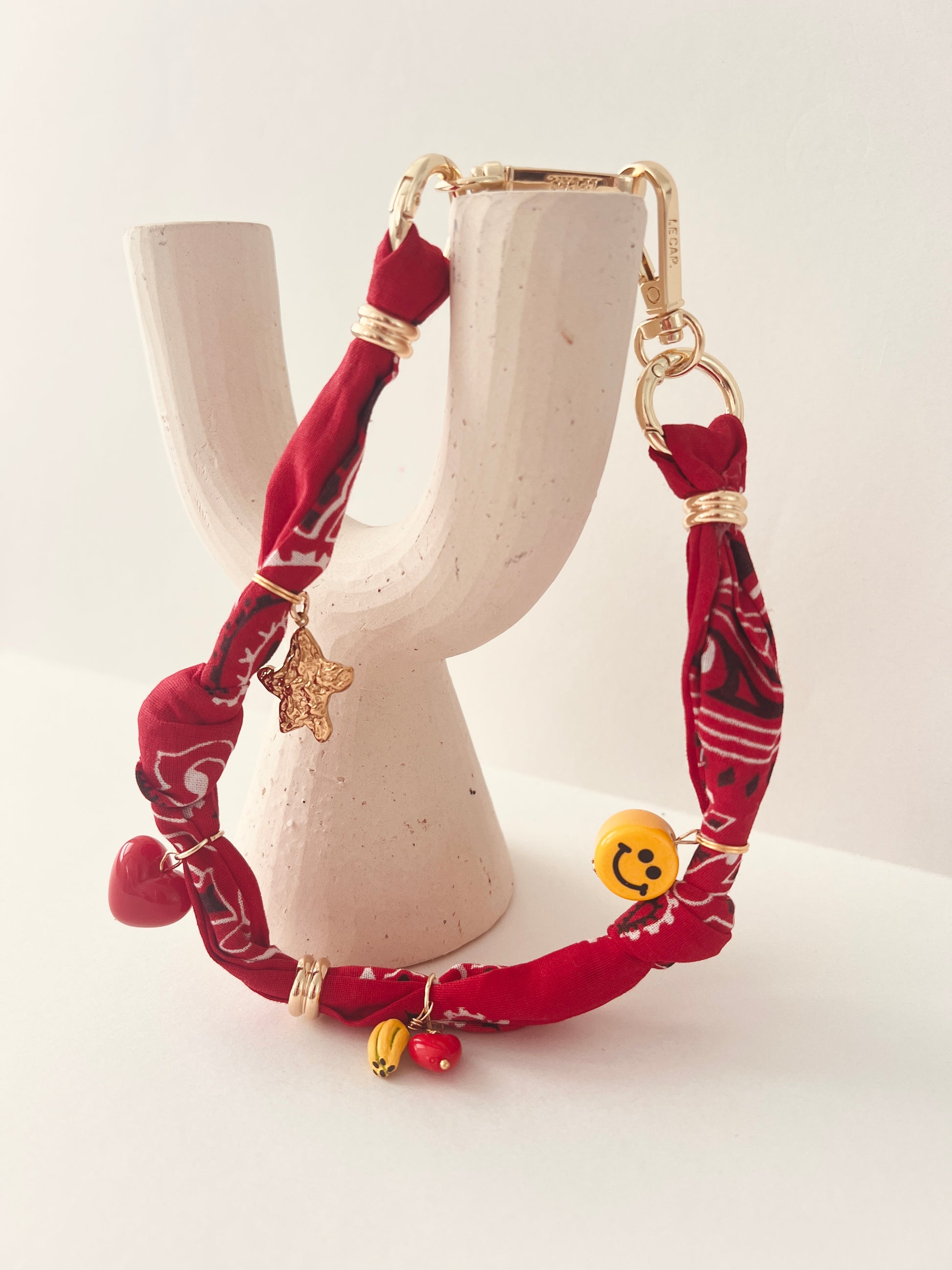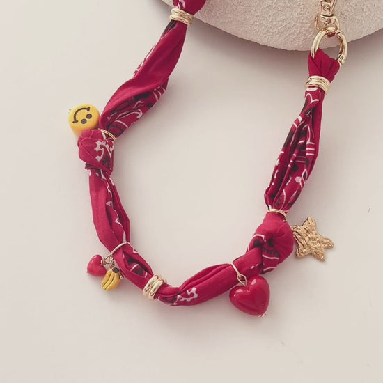 Knotted cotton bandana wrist strap with charm and bead detail.