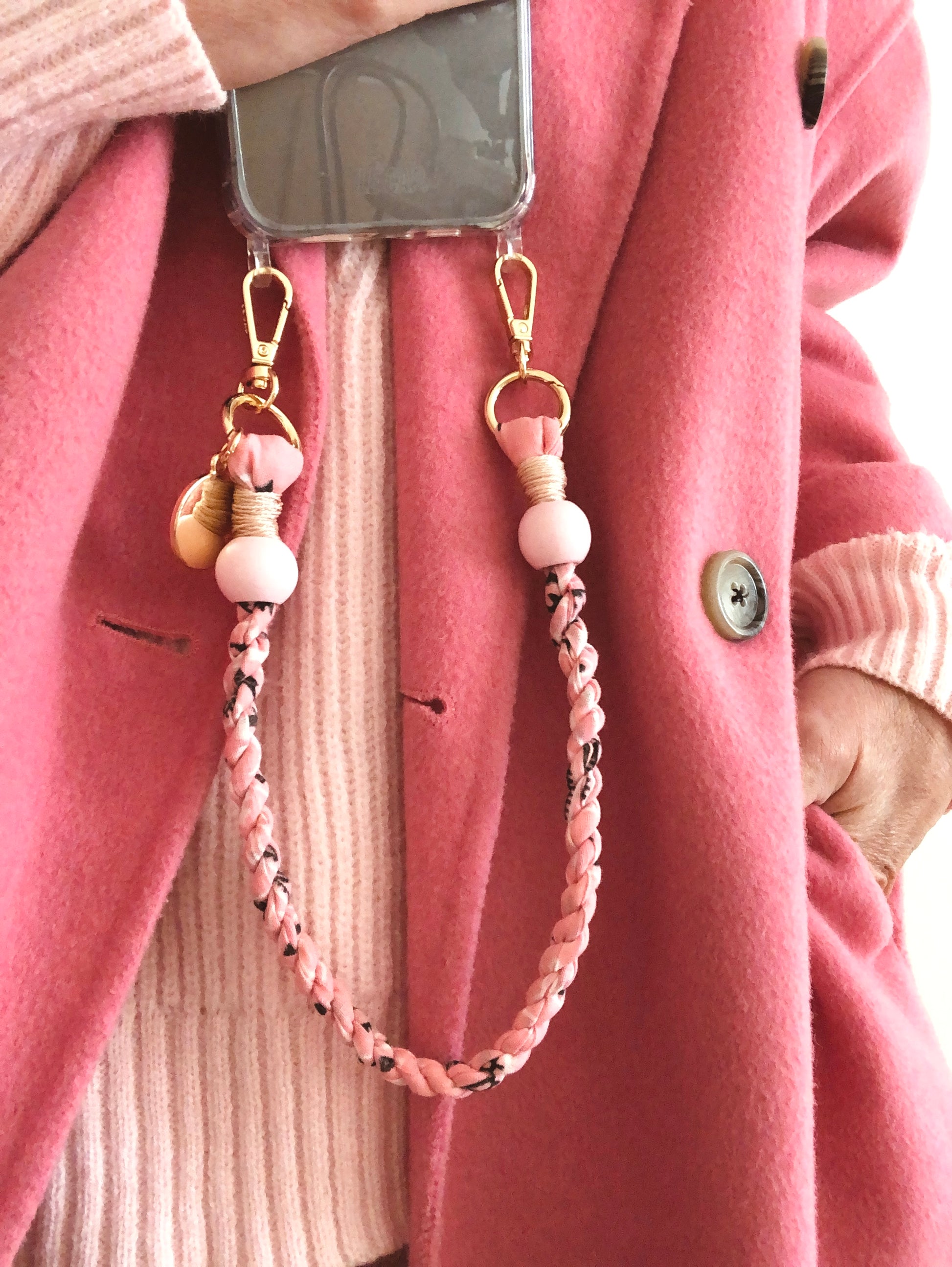 Handcrafted twisted fabric wrist or shoulder strap with bead detail.