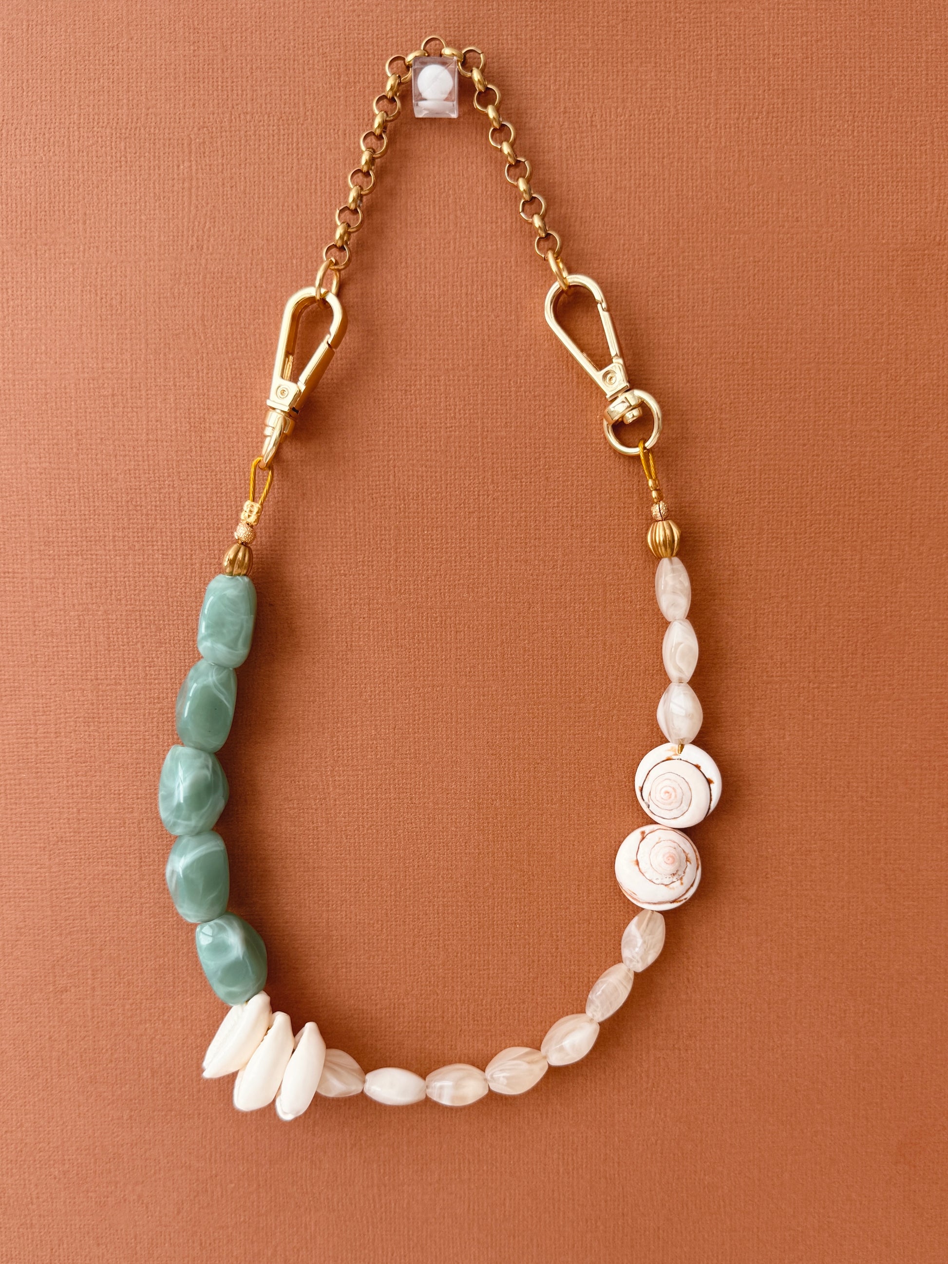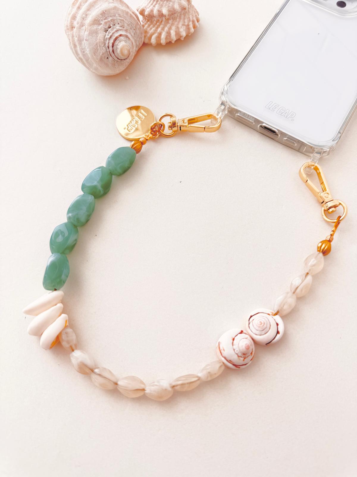 This beaded wrist strap combines shell, metal and acrylic beads. A colour story born from the white-washed back streets of Île de Ré.